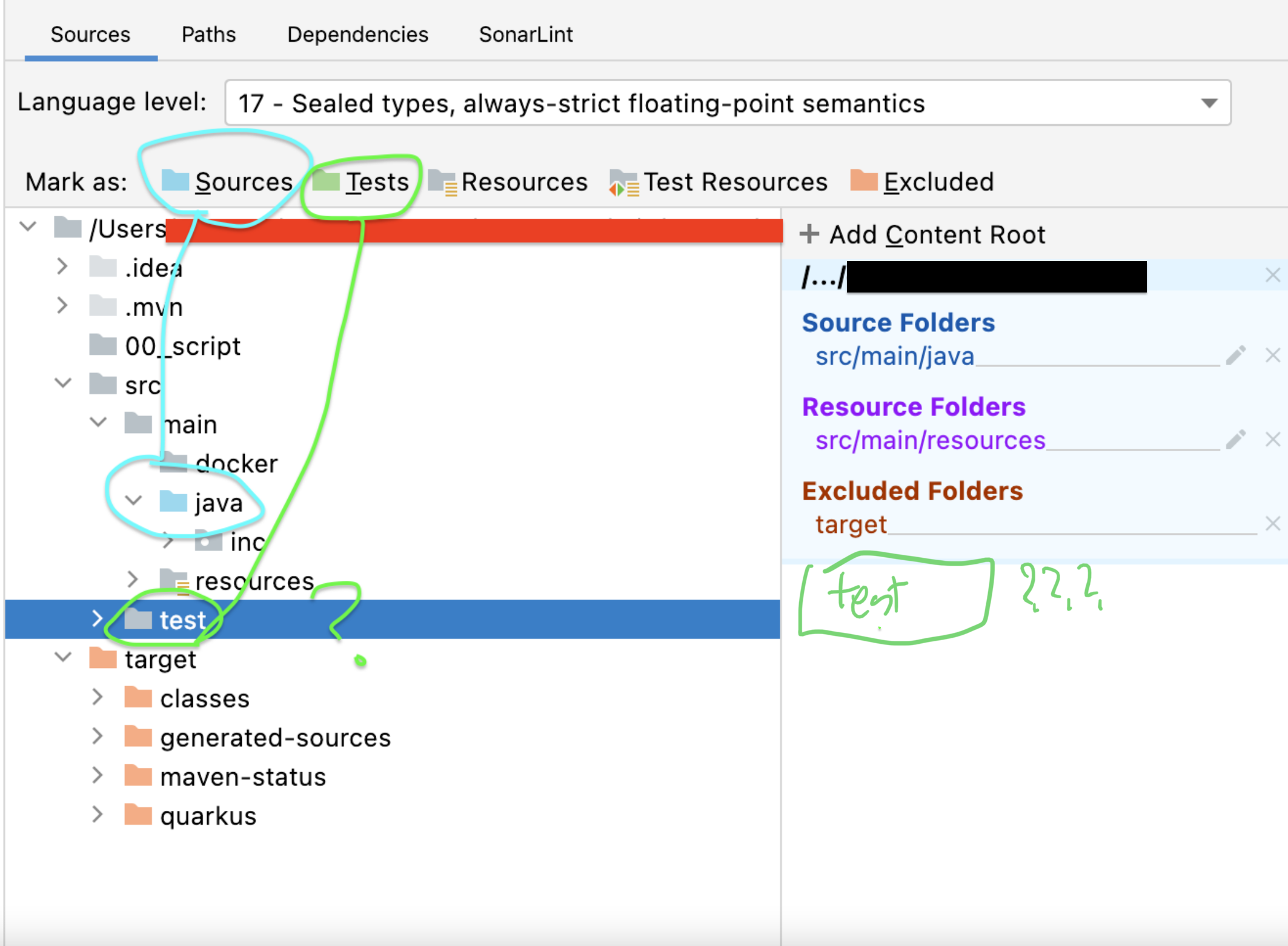 Content Root 로 test 폴더가 누락되어 있는 것을 확인